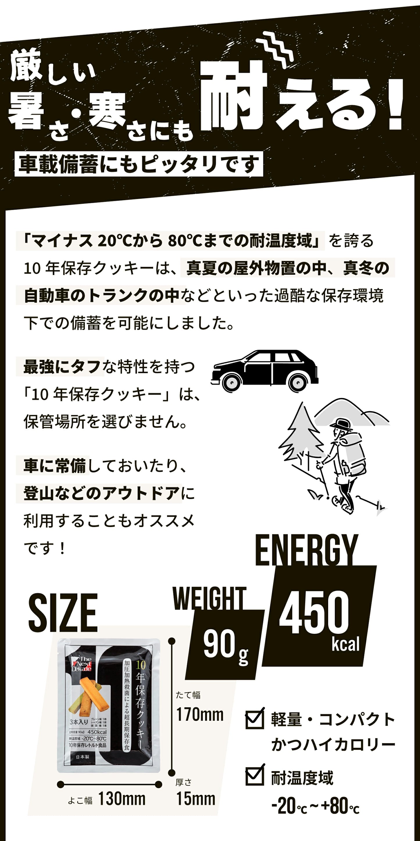 「10年保存クッキー」はマイナス20℃~80℃の温度変化に耐えられる設計。