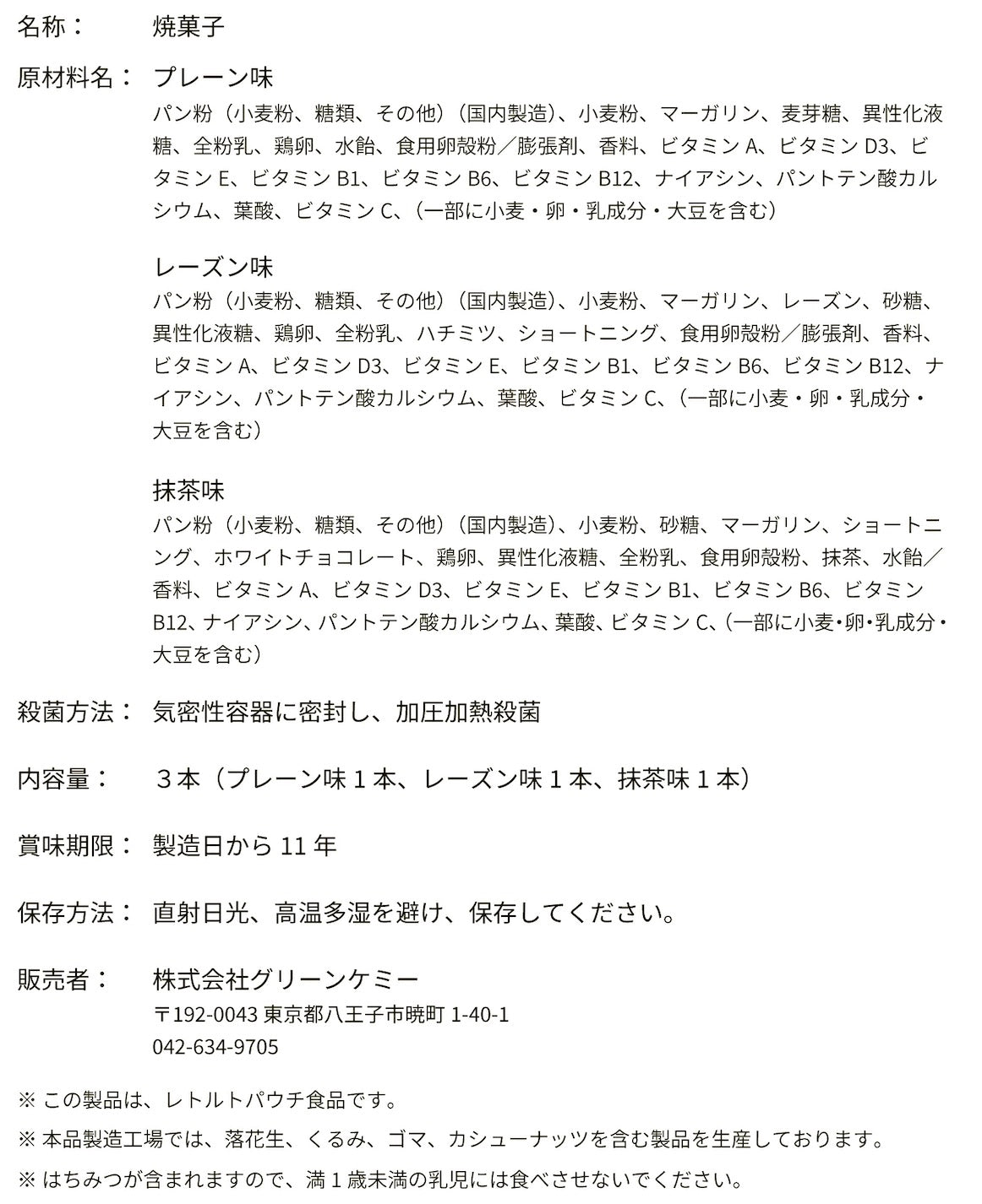 | 内容量 | 1袋あたり3本(プレーン味、レーズン味、抹茶味 各1本入り) |